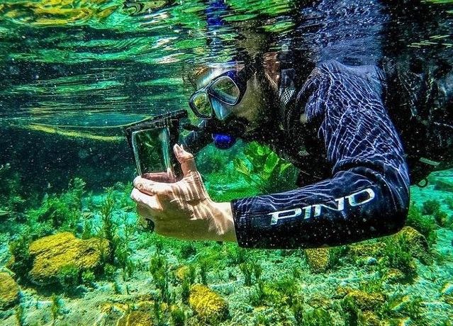 O cenário lembra muito o fundo do mar, porém, com água doce. O atrativo disponibiliza um barco de apoio durante toda a atividade.