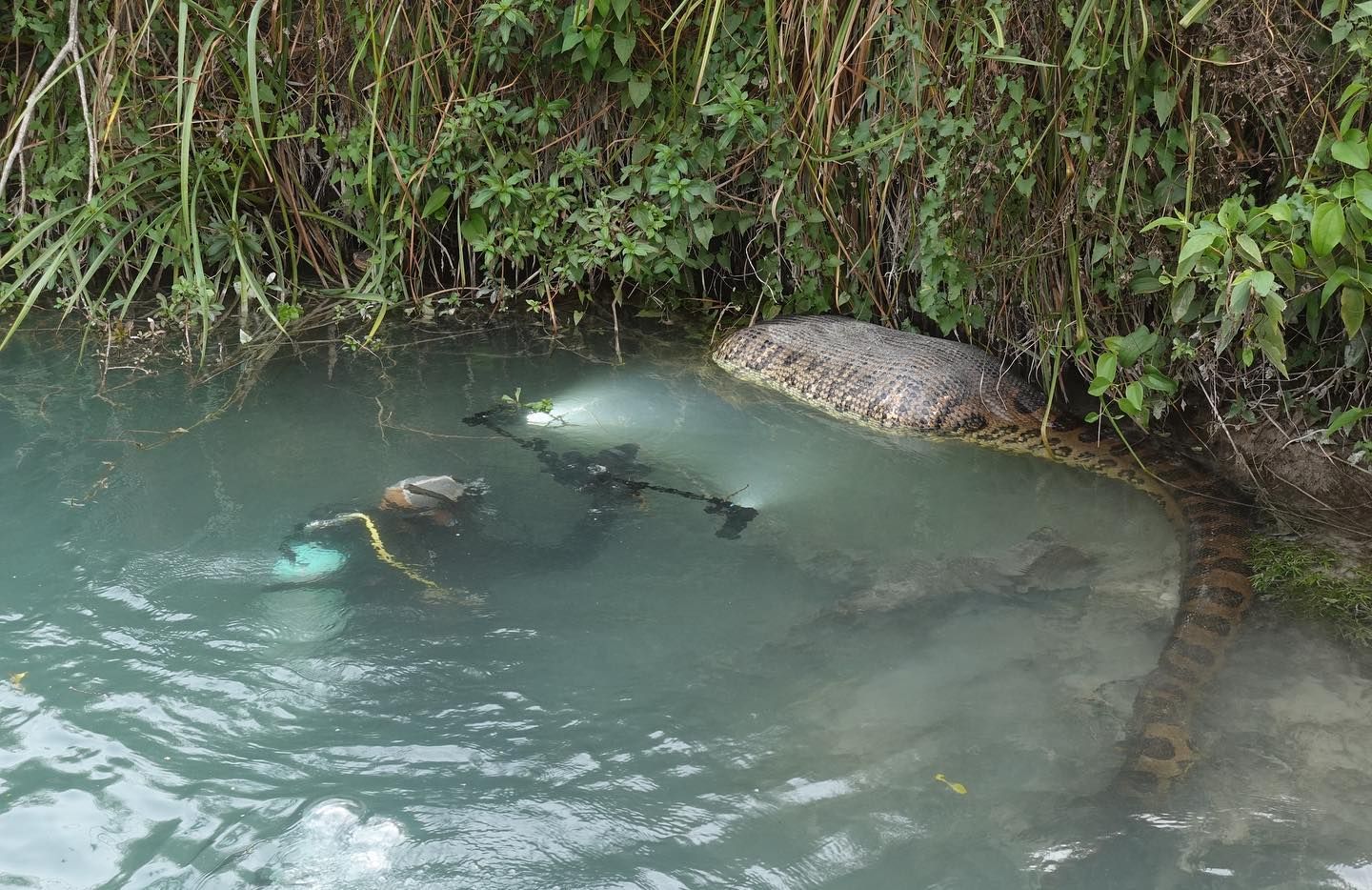Ao mergulhar nas águas do rio Formoso, Martinez deparou-se com uma enorme sucuri descansando entre a vegetação submersa. O animal, que aparentemente havia se alimentado recentemente, estava totalmente imóvel, curtindo o ambiente enquanto digeria o alimento.