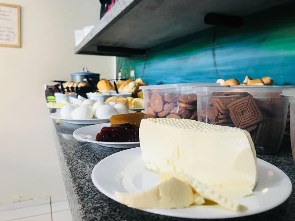 O café da manhã serve café, leite, pão, bolo, queijo, ovos e frutas da estação
