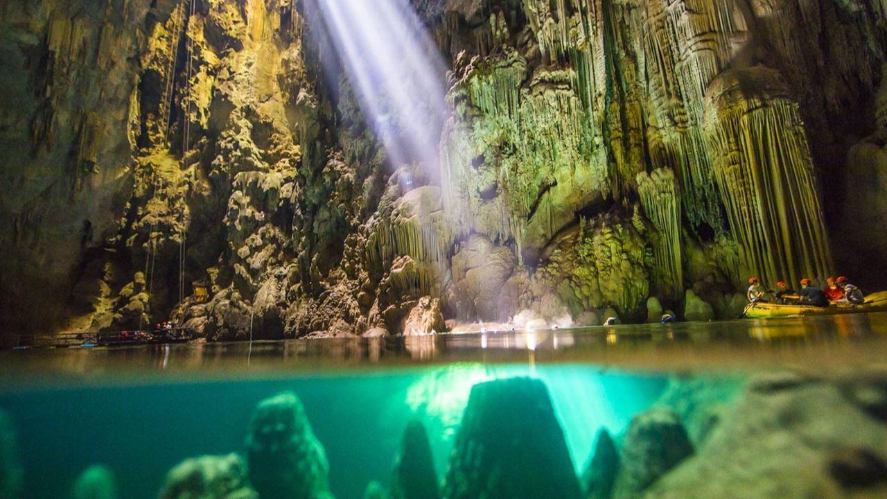 Esta caverna impressionante abriga um lago subterrâneo de um azul profundo, cuja cor é resultado da refração da luz do sol que penetra na caverna.