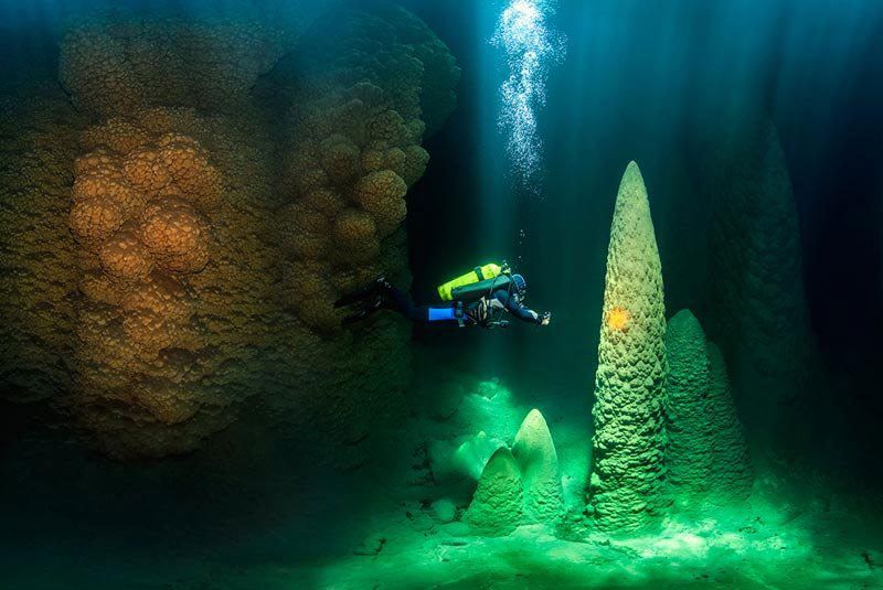 Durante a descida você poderá contemplar uma vista panorâmica de todo o salão da caverna, simplesmente espetacular! O lago onde é feito o mergulho possui 20 metros de profundidade e você encontrará diversos cones gigantes, além de outras formações rochosas milenares.
