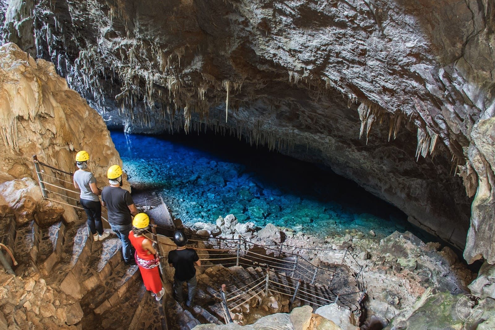 Após realizar uma pequena trilha na mata, o visitante chega até a entrada da caverna e desce cerca de 60 degraus até o lago. A paisagem com formações rochosas e o lago azul é impressionante!