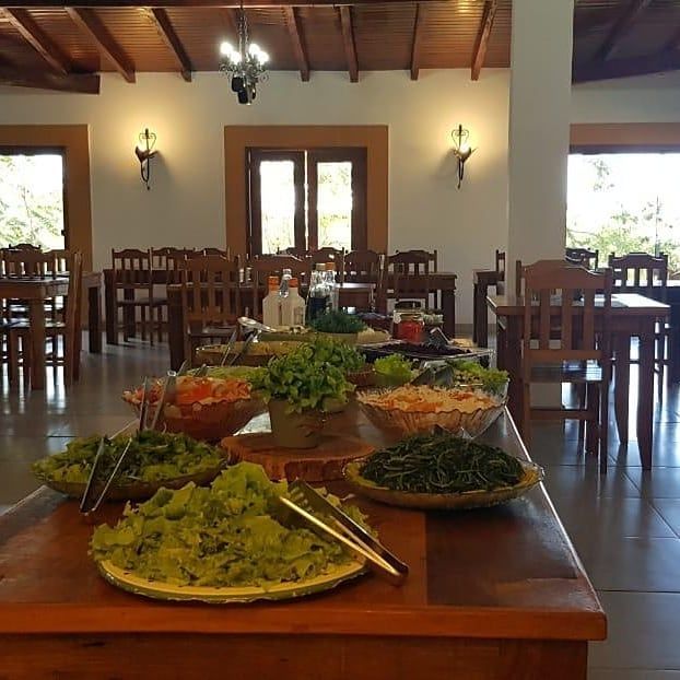 O restaurante do Cachoeiras Serra da Bodoquena oferece um almoço buffet. São servidas 12 opções de saladas frescas e 12 pratos quentes todos os dias.