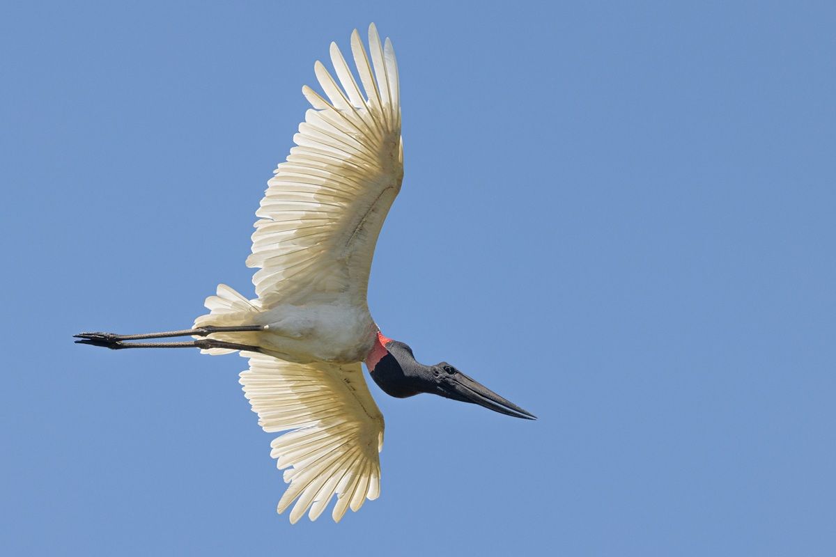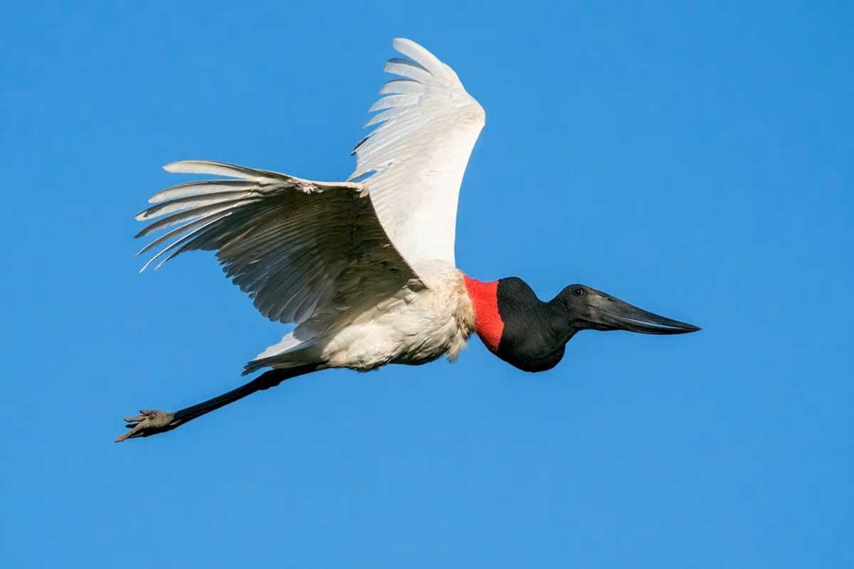 É uma das aves mais emblemáticas do Brasil e o símbolo oficial do Pantanal. Com sua plumagem branca, pescoço preto e uma faixa avermelhada marcante na garganta, ele é facilmente reconhecido.