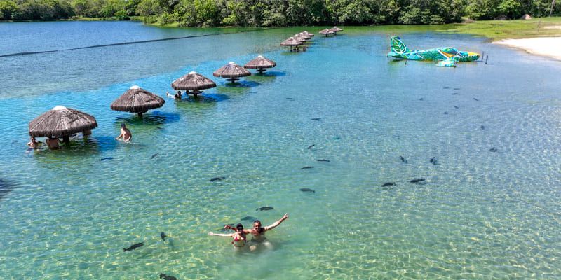 E tem mais! Você ainda vai poder alimentar os peixes com ração e fazer fotos lindas com eles. Aliás, a possibilidade dessas fotos costuma chamar muita atenção nas redes sociais, principalmente as que são registradas no local mais próximo à estrutura restaurada de um avião que caiu na guerra do Paraguai e foi instalado na lagoa.