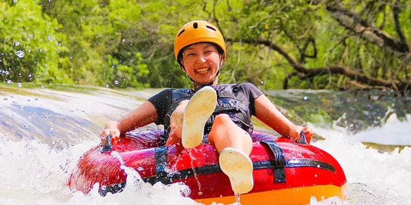 O passeio de Boia Cross no Parque Ecológico é realizado em boias infláveis individuais por um trecho de corredeiras e pequenas quedas no Rio Formoso.