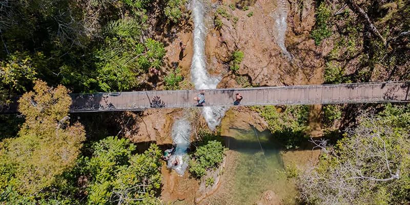 Não se assuste, a caminhada é tranquila e intercalada por 06 paradas para banho, um 01 trampolim, 01 tirolesa e 04 pontes suspensas. Pela facilidade de acesso, esse é um passeio que pode ser realizado por crianças e idosos, mas não é permitido para gestantes com 20 semanas ou mais de gravidez.