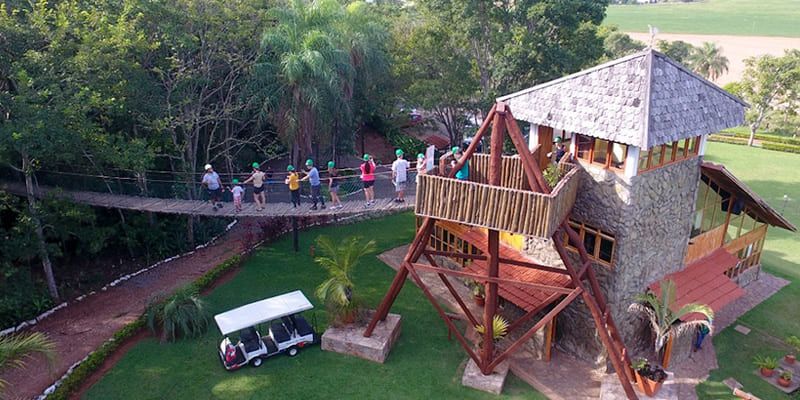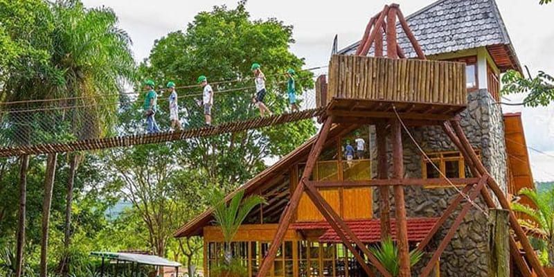 Caminhando, o percurso que inclui a passagem pela ponte pênsil de quase 200 metros de extensão, permite que você possa aproveitar o caminho por entre as copas das árvores até a entrada principal.