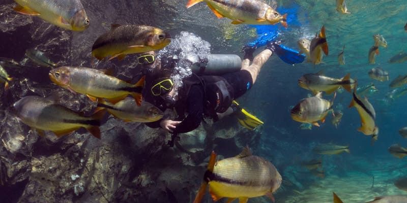 Assim é o mergulho com cilindro no Recanto Ecológico Rio da Prata, localizado a 50,6 km de Bonito MS.