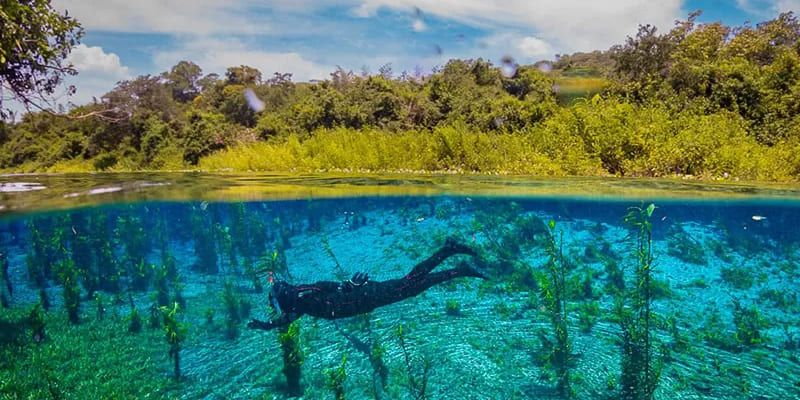 Uma das vantagens em conhecer o passeio Nascentes da Serra é o contato com a natureza, descrito como uma experiência transformadora por sua proximidade com o Pantanal e por ser completamente diferente das outras flutuações em Bonito.
