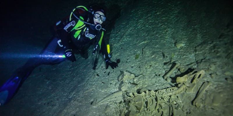 Apesar do ambiente escuro em alguns pontos da caverna onde a luz entra é possível ver a beleza subaquática do local.